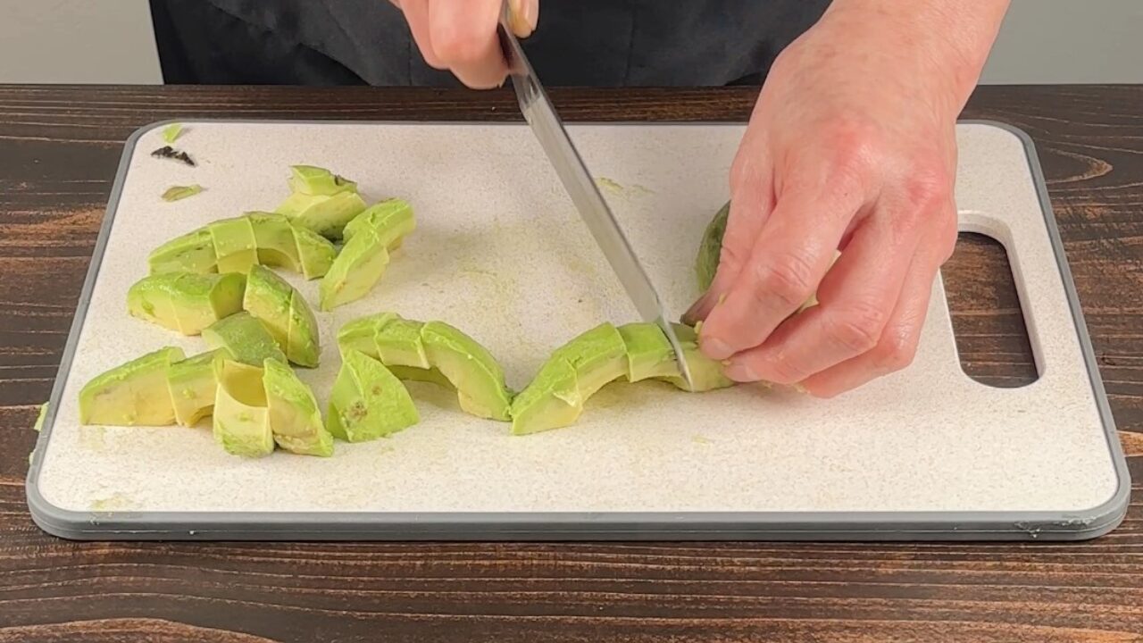 アボカドは種を取って皮をむき、イチョウ切りにします。