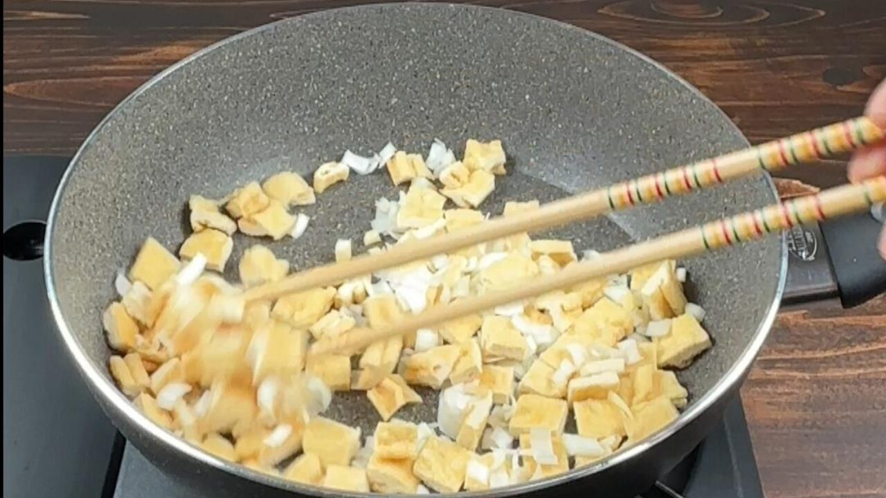 フライパンを中火で熱し、油揚げとネギを炒めます。