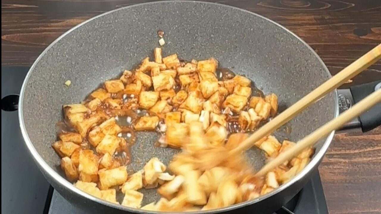 油揚げにおいしそうな焼き色がついたら火を止め、余熱で調味料をからめます。
