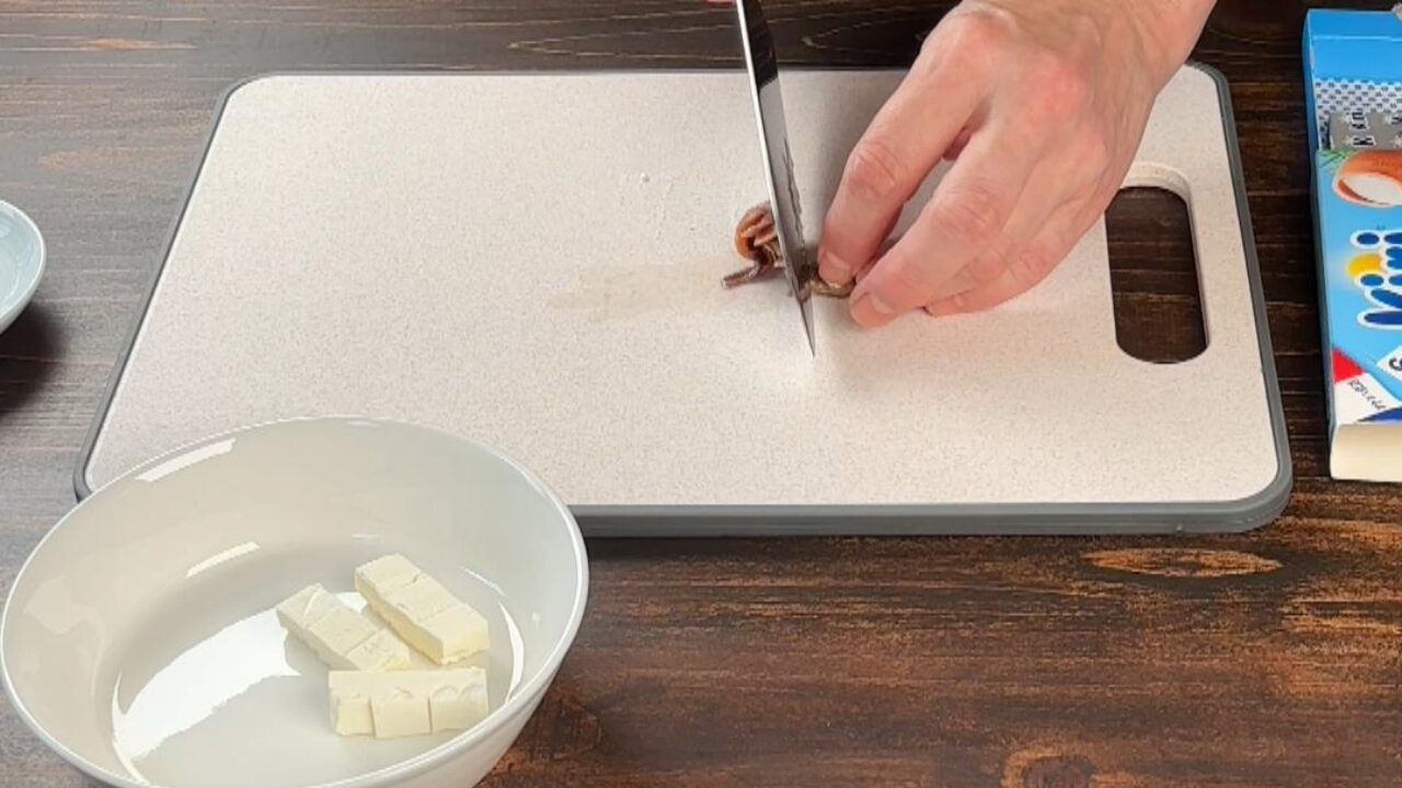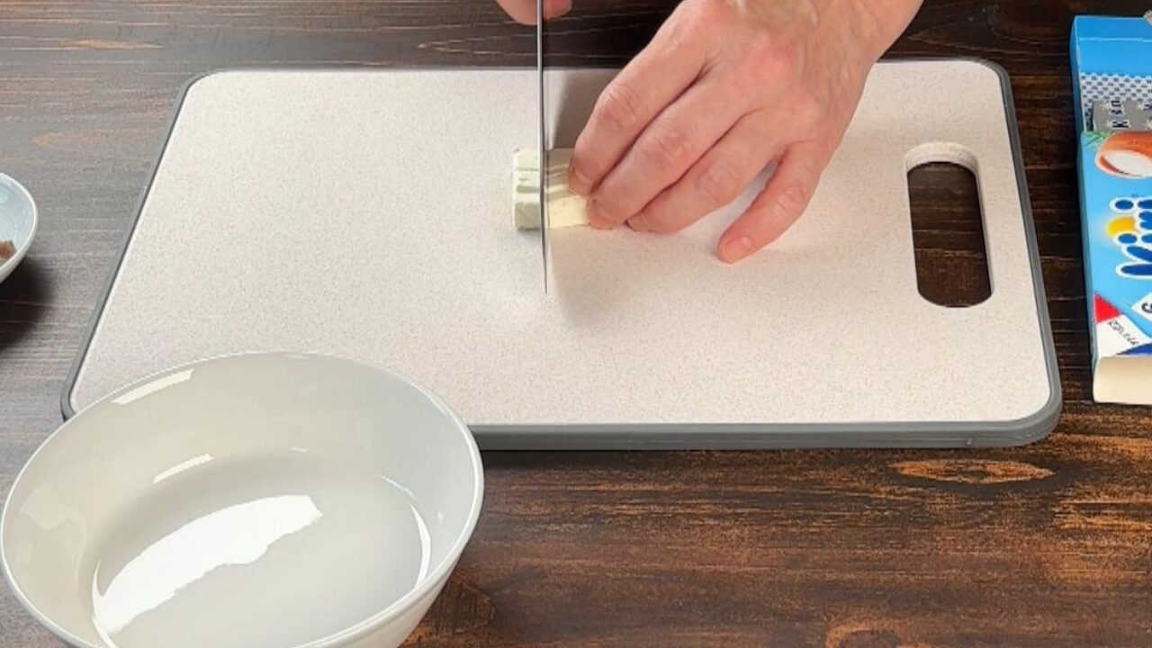 クリームチーズをサイコロの形に切ります。