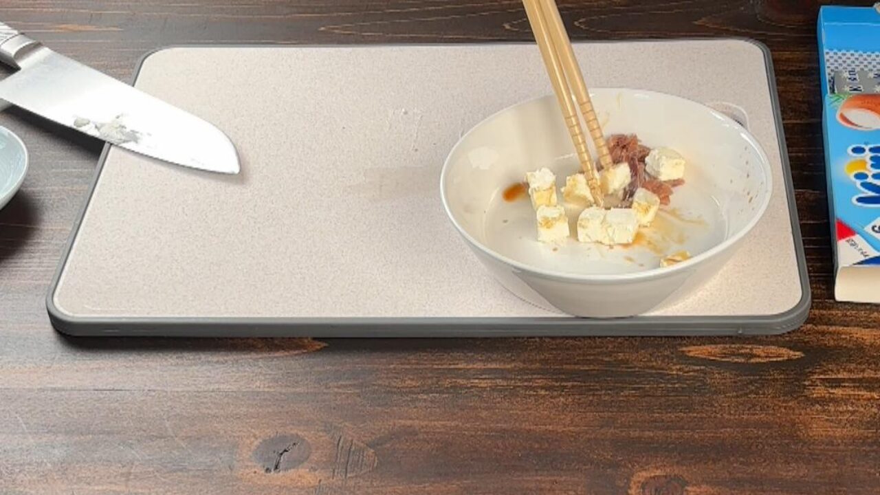 チーズとアンチョビを器に入れ、醤油を3~4滴たらして混ぜます。