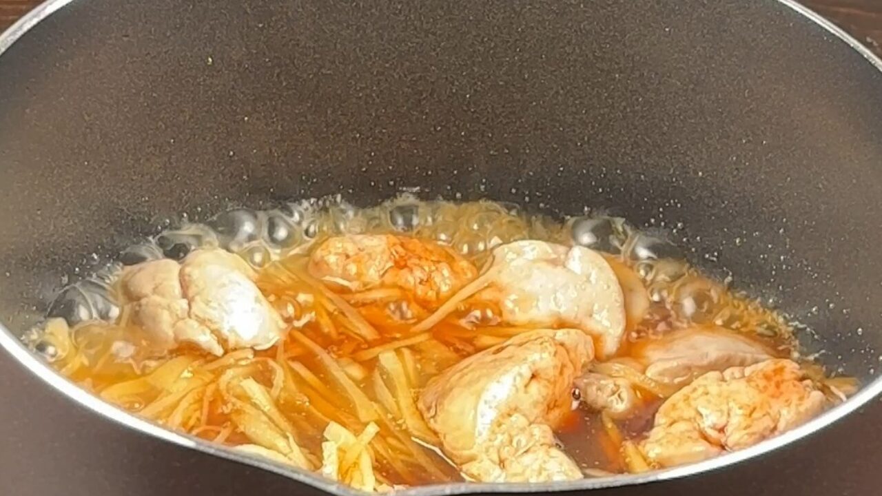 煮汁が半分に減ったら醤油も入れ、中火で煮ます。