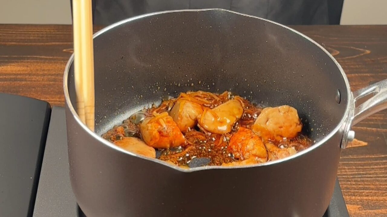 鍋底に煮汁が少し残っている状態で火からおろします。