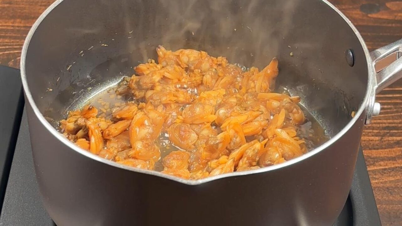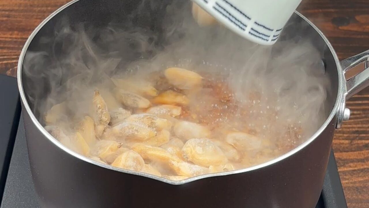 煮立ったらアサリを凍ったまま入れ、煮詰めていきます。