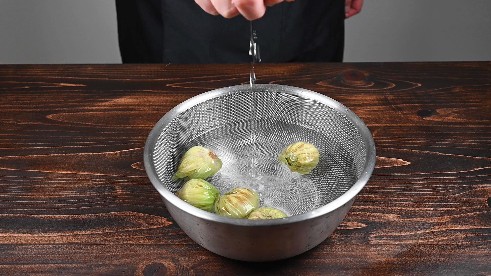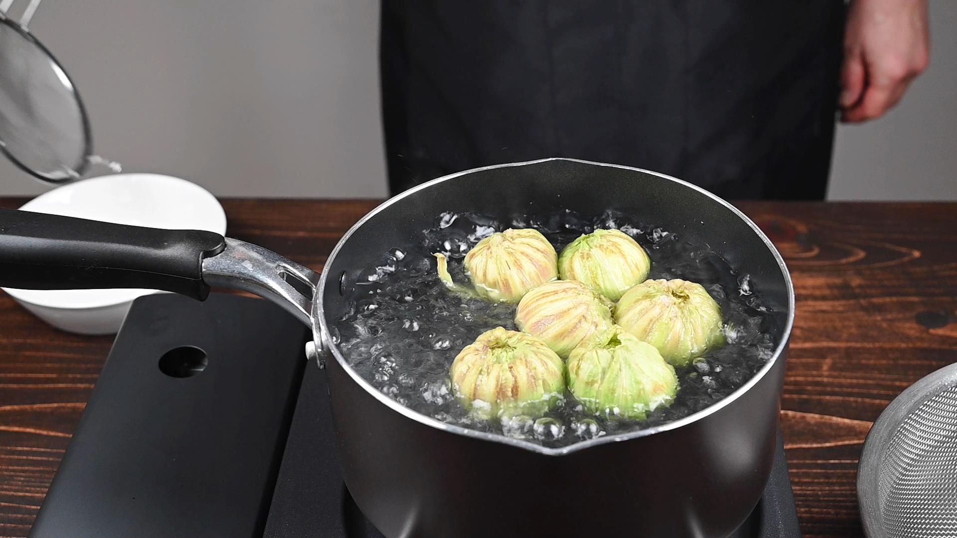60秒ゆでたら水に取り、しっかり水をしぼります。
