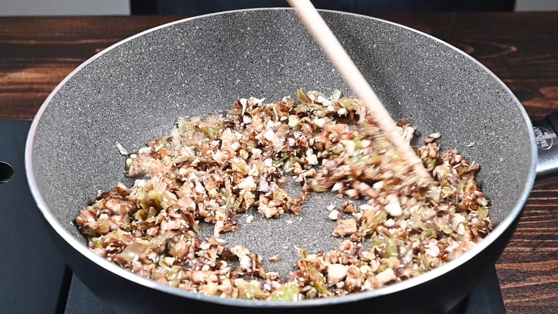 フライパンにゴマ油を中火で熱し、ふきのとうを炒めます。
