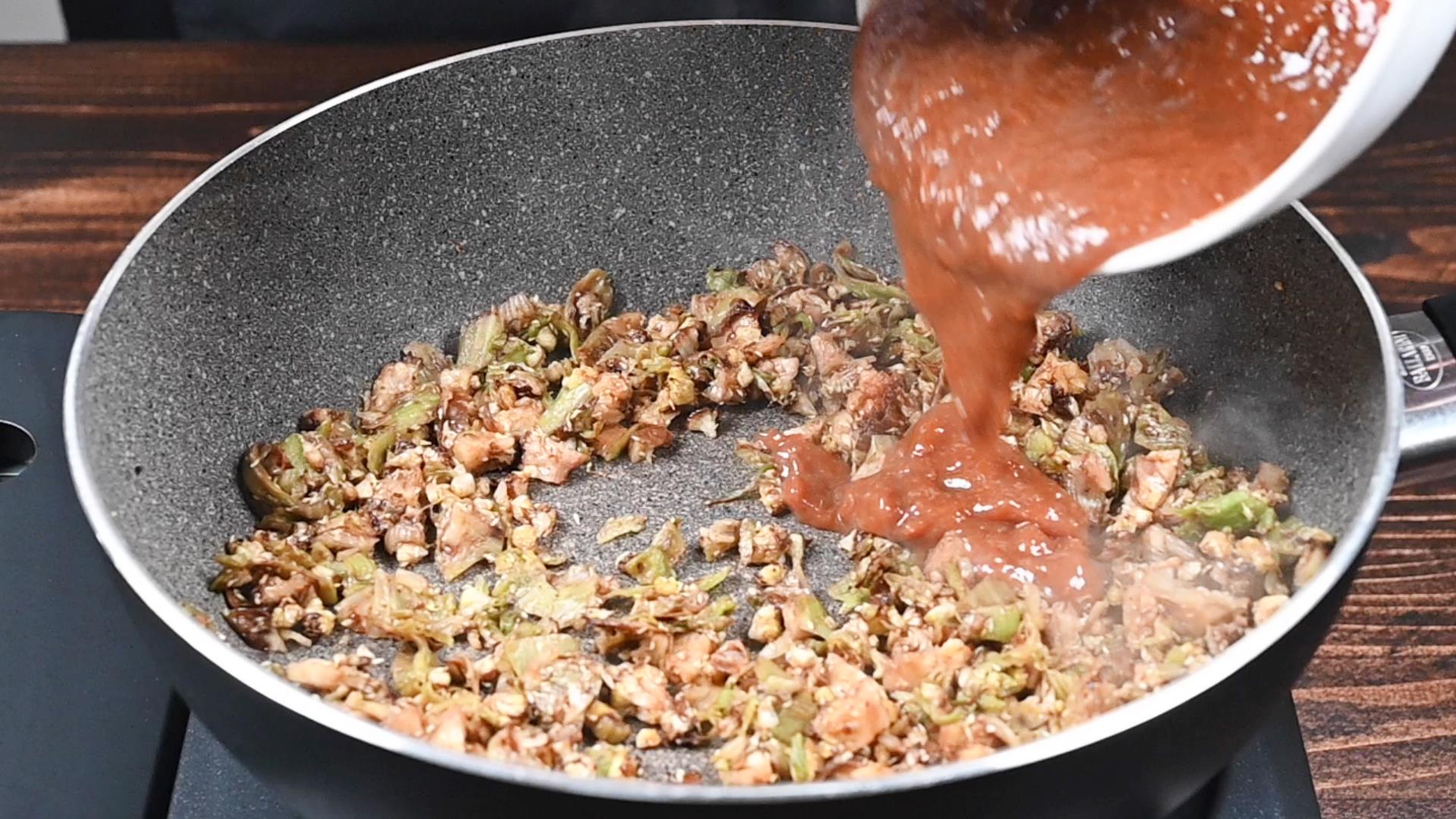 ふきのとうに油が回ったらいったん火を止め、混ぜ合わせた調味料を入れます。