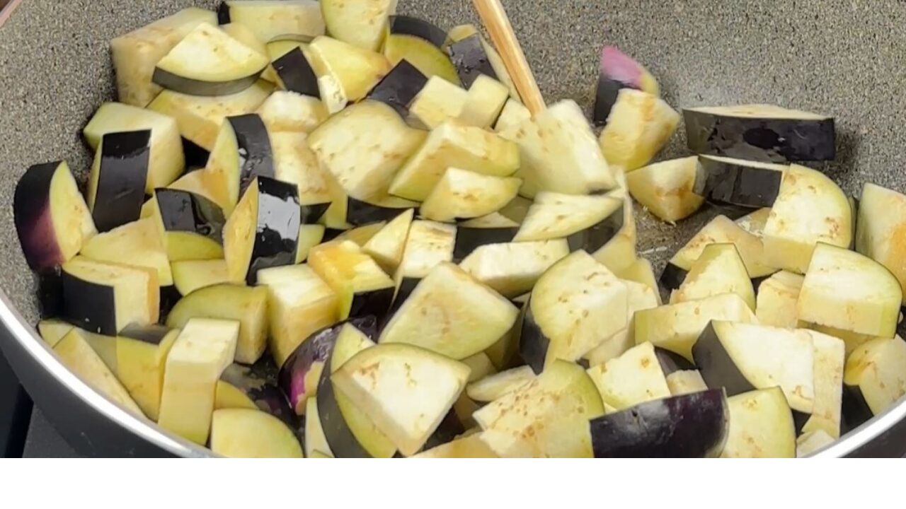 フライパンにゴマ油を強めの中火で熱し、ナスを炒めます。