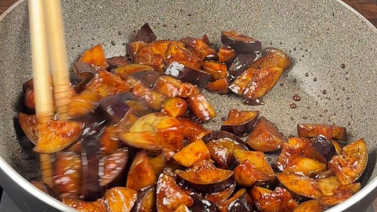 ナスにだいたい火が通ったらいったん火を止め、混ぜておいた調味料を入れて弱火で軽く炒めます。