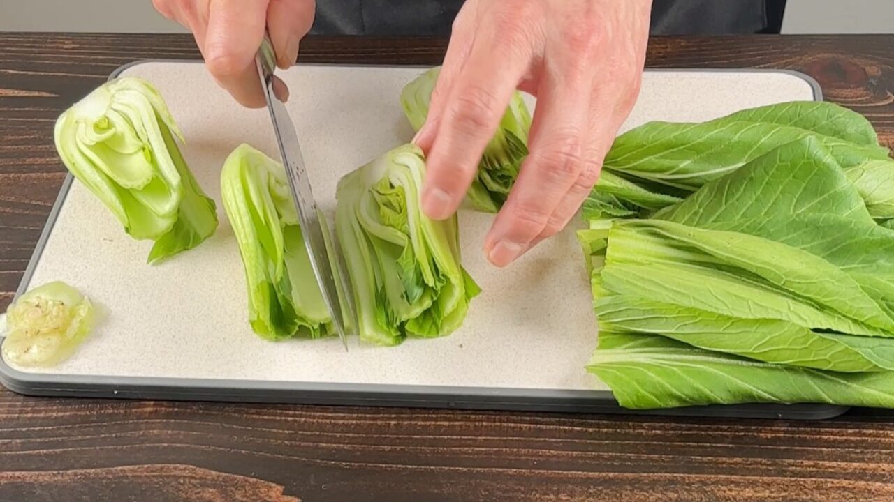 青梗菜は葉と茎に分け、茎は縦半分に切ります。
