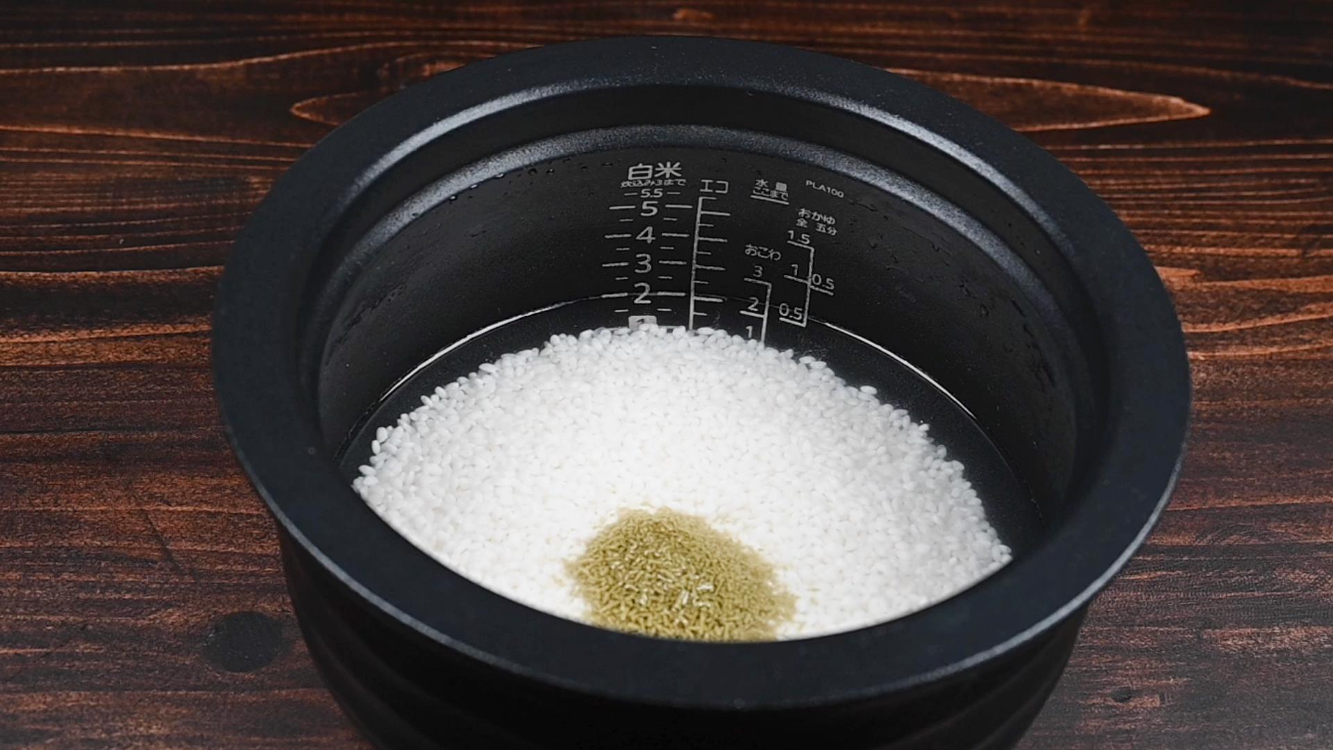 お米が水を吸ったら昆布茶を入れ、炊飯器のスイッチを入れます。