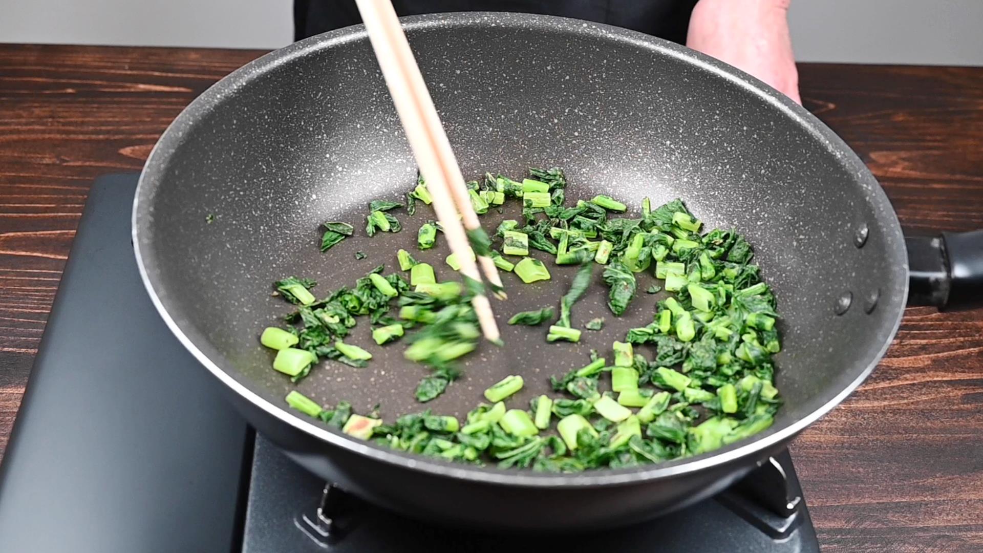 フライパンに大根の葉と塩を入れて煎ります。