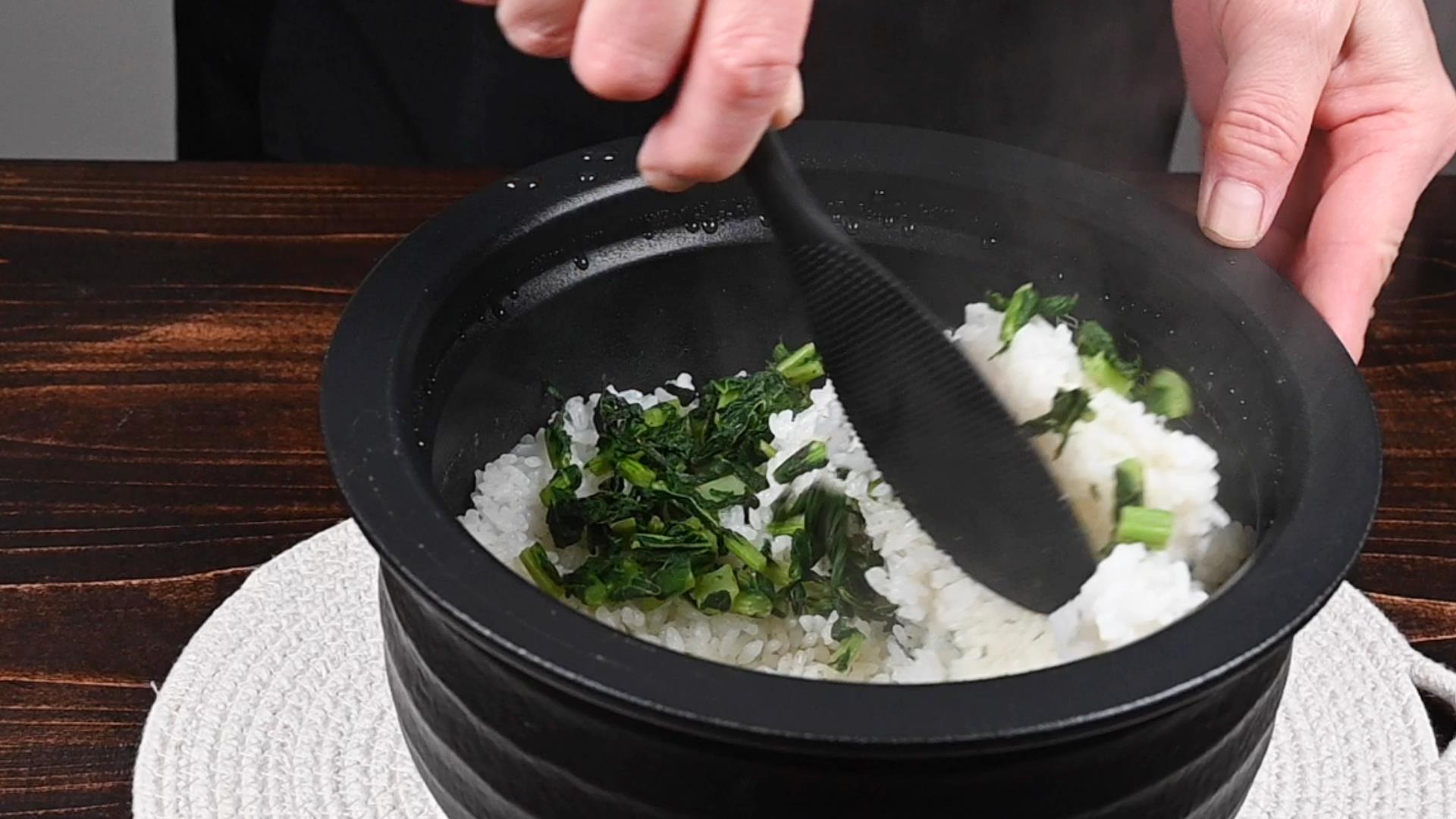ごはんが炊けたら煎った大根の葉を入れて混ぜます。