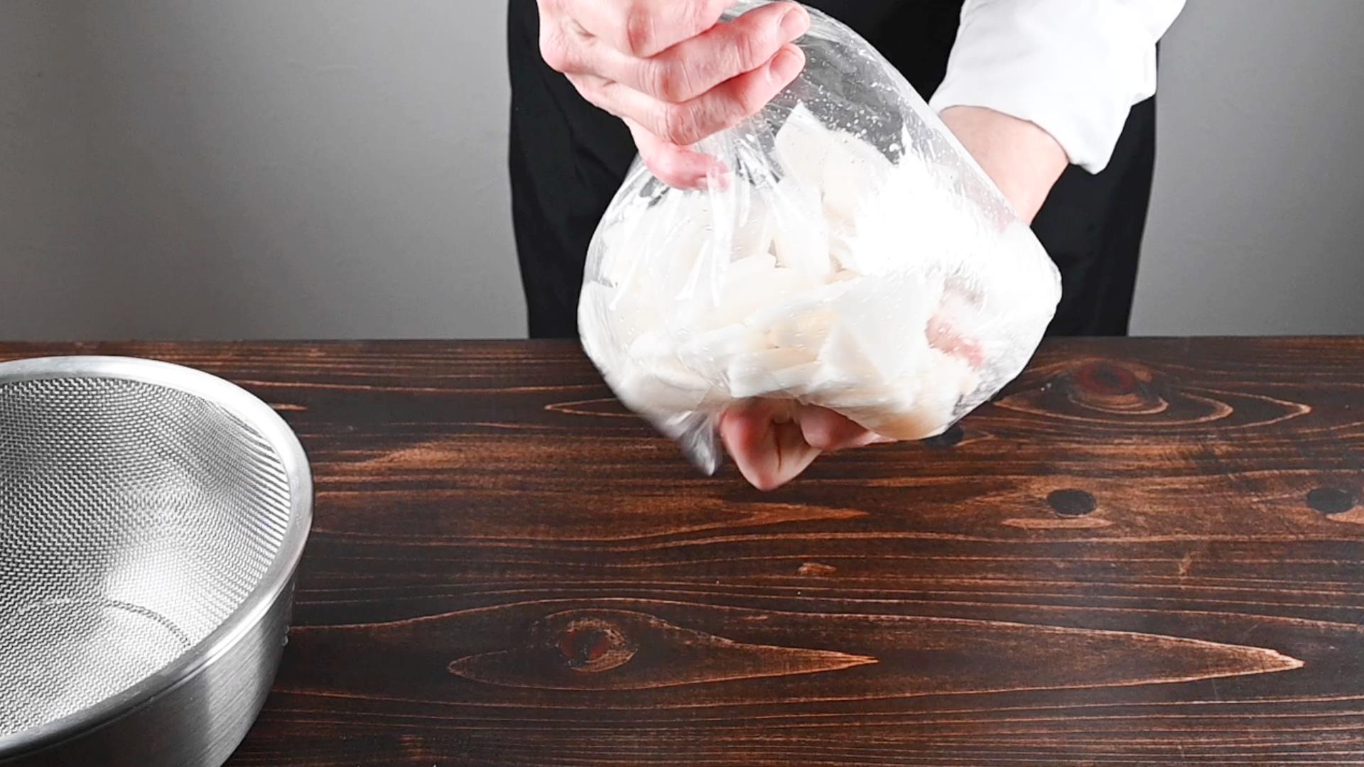 大根から水が出てくるので、ザルに上げて水を切ります。