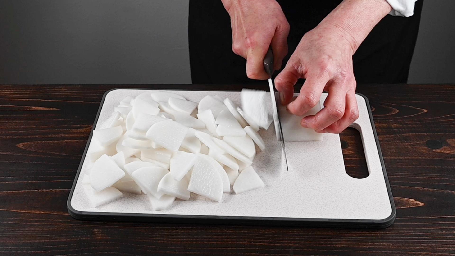 大根は皮をむいてイチョウ切りにします。
