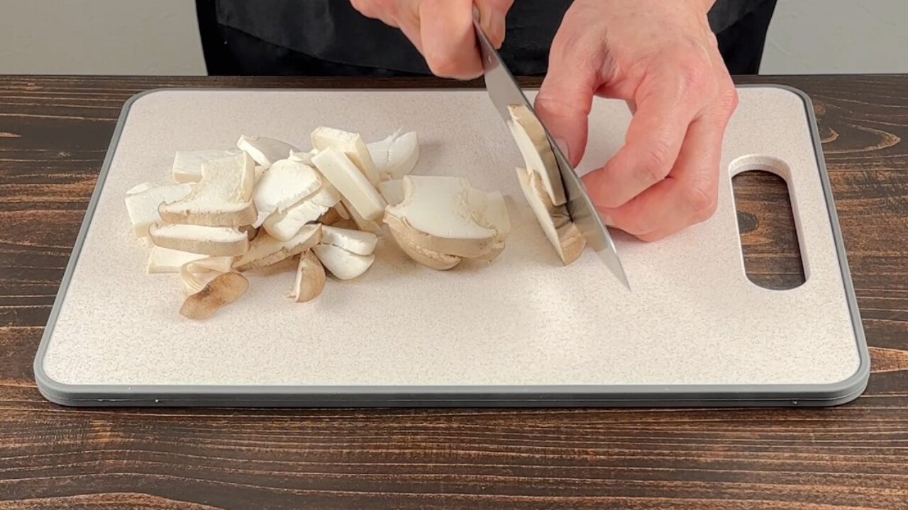 エリンギは根元に硬い所があれば切り落とし、薄切りにします。