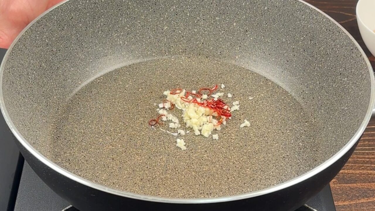 フライパンにニンニクと輪切り唐辛子、サラダ油を入れて弱火にかけます。