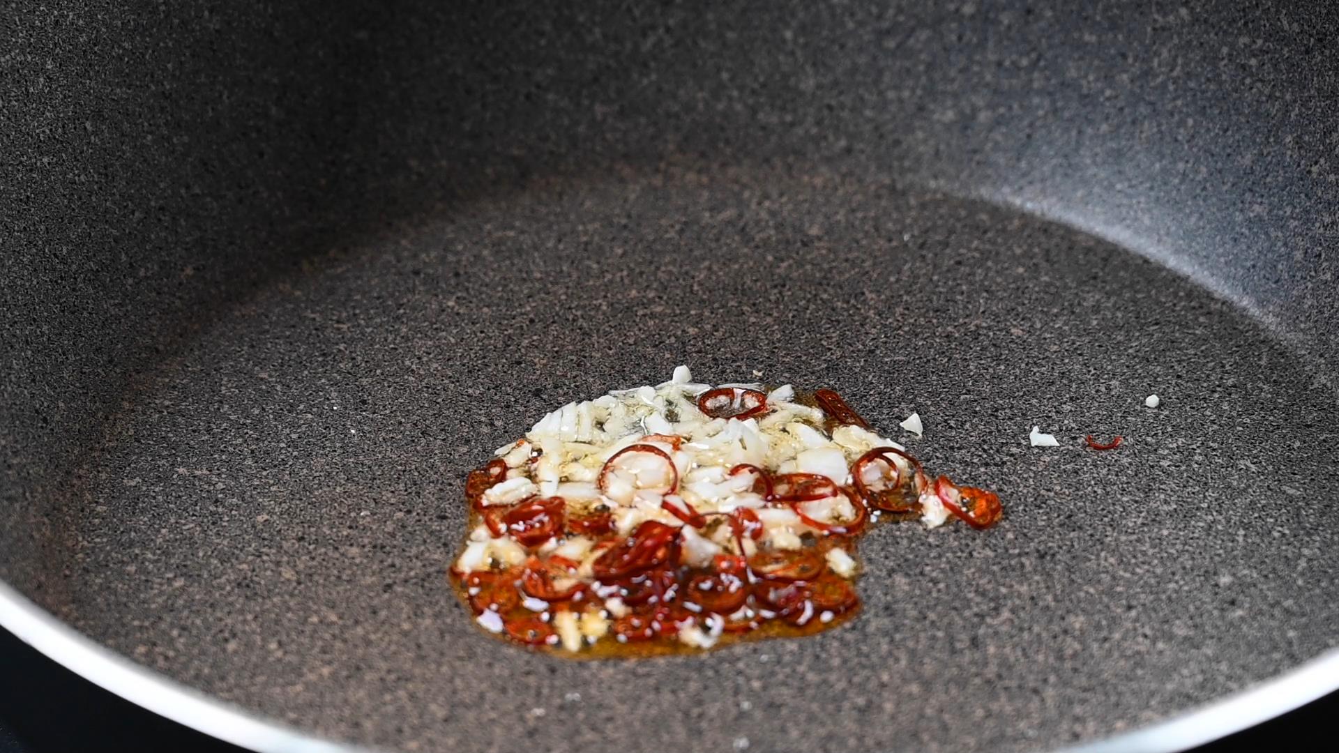フライパンにサラダ油(小さじ1)とニンニクのみじん切り、唐辛子の輪切りを入れ、弱火で炒めて香りを出します。