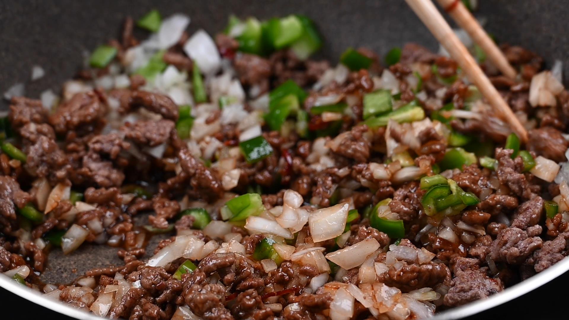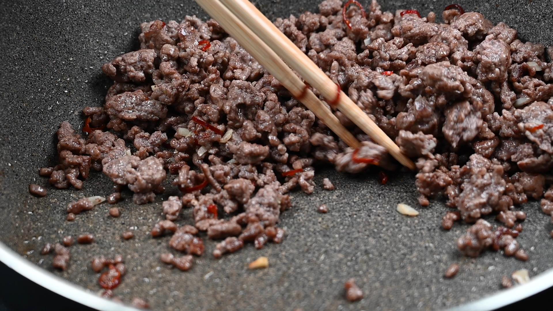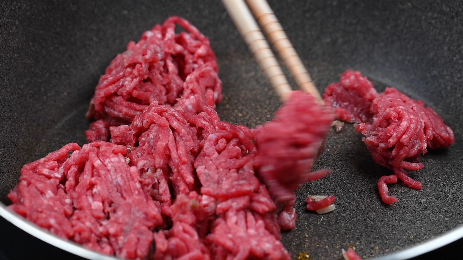 香りが立ってきたらひき肉を入れ、中火で炒めます。