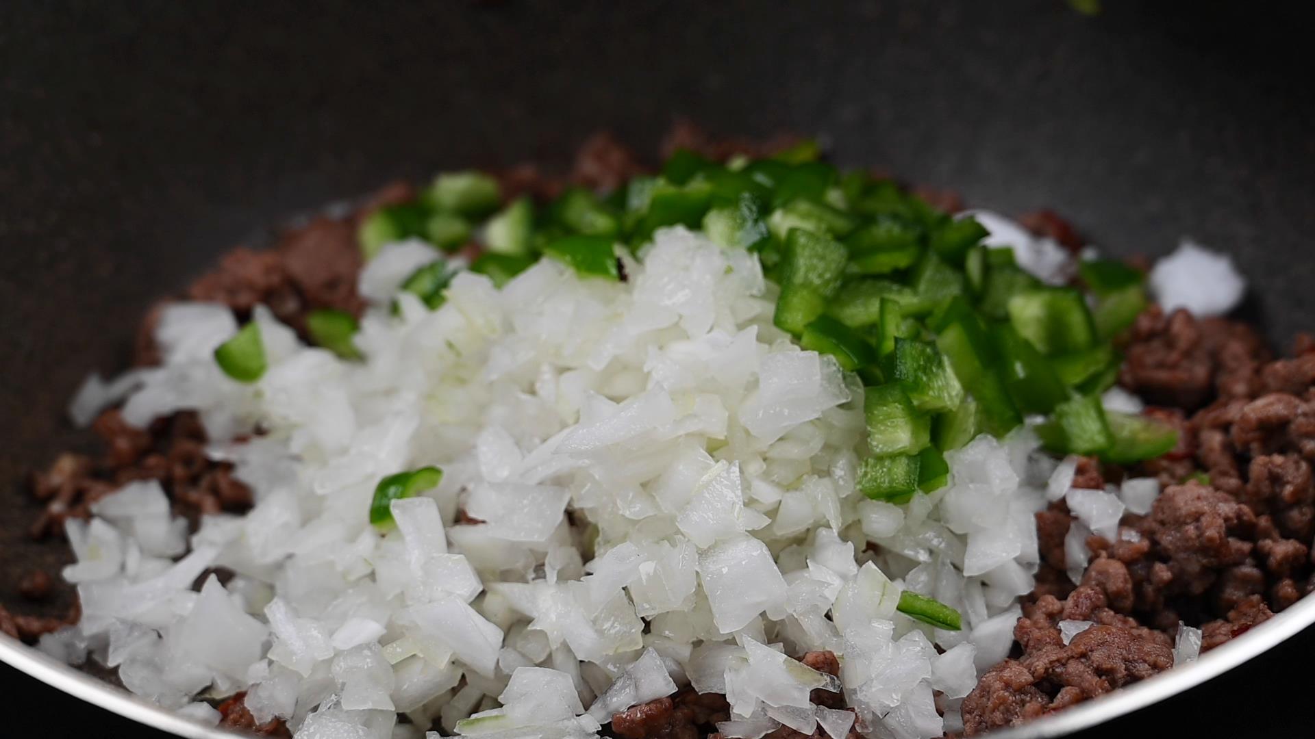 調味料とピーマンと玉ねぎを入れます。
