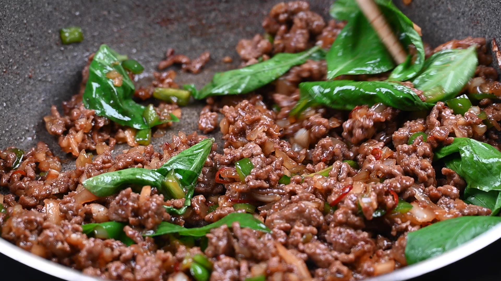 野菜に火が通ったらバジルを入れ、しんなりするまで炒めます。