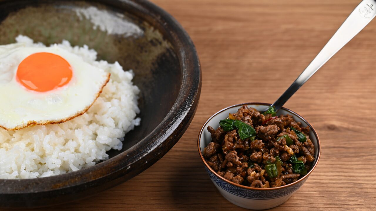 ごはんに目玉焼きをのせて崩しながらお召し上がりください。