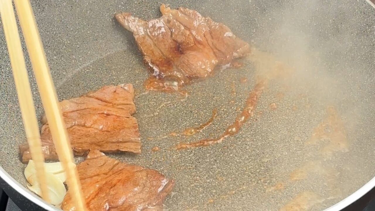 肉が焼けたら火を消し、醤油を入れて余熱でからめます。