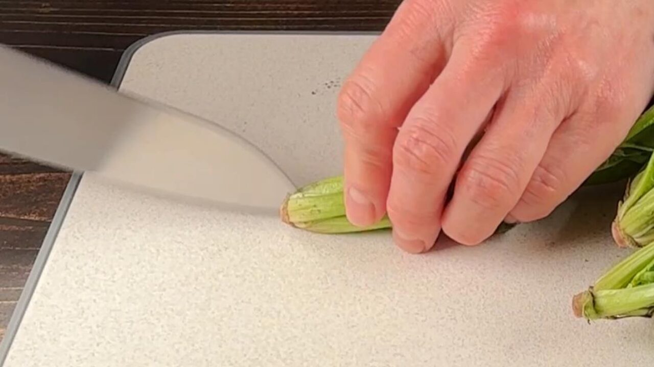ほうれん草は根元に十字の切れ目を入れます。