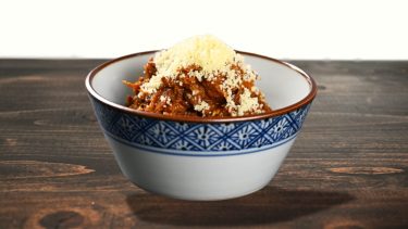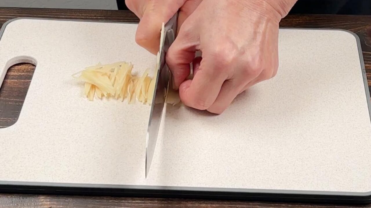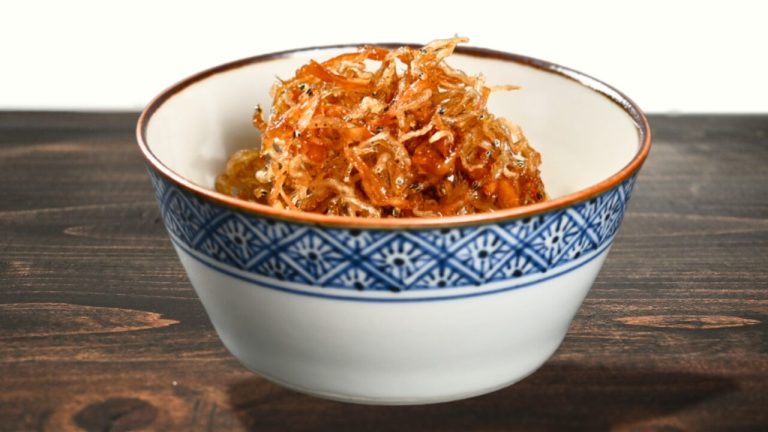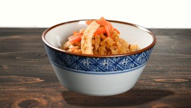 チリメンジャコに油が回ったらいったん火を消し、混ぜ合わせておいた調味料とショウガを入れ、こがさないよう弱火で、汁がだいたい無くなるまで煮詰めます。