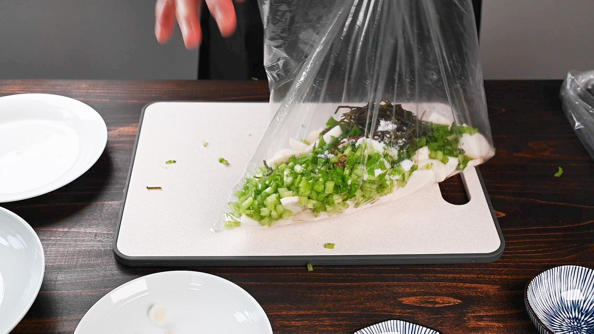 ポリ袋にカブの実と葉、切り昆布、輪切り唐辛子、塩を入れて振ります。