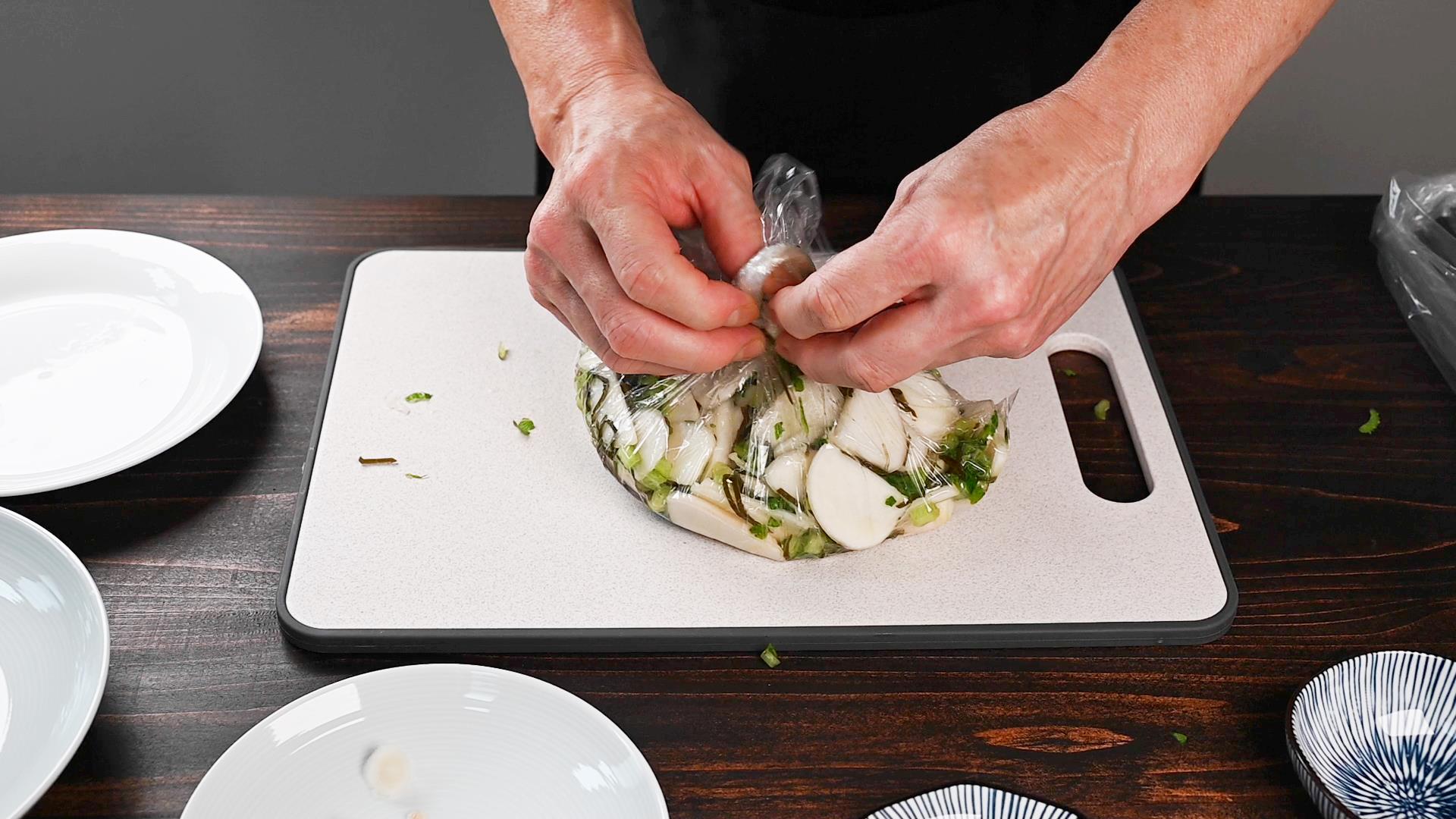 急ぐ場合は、30分位してカブがしんなりしてきた頃、袋の上から軽くもむと早く食べられます。