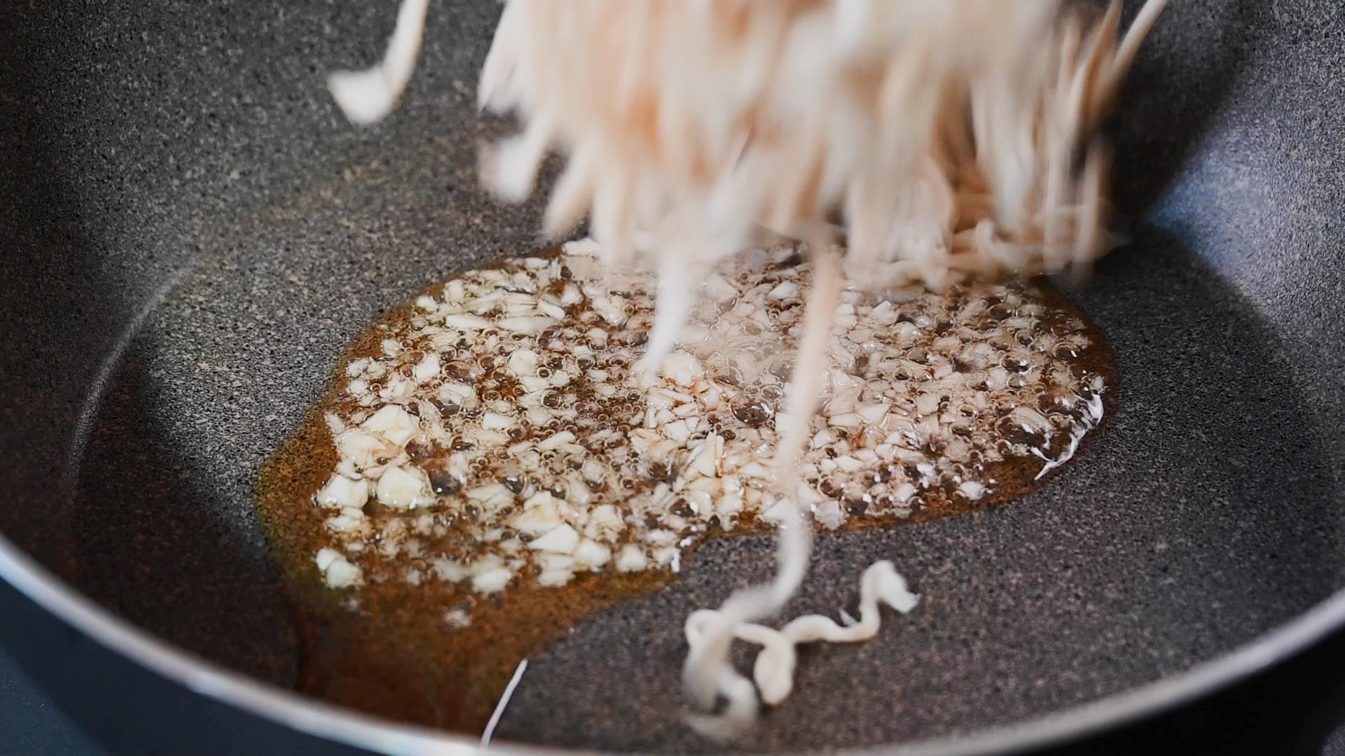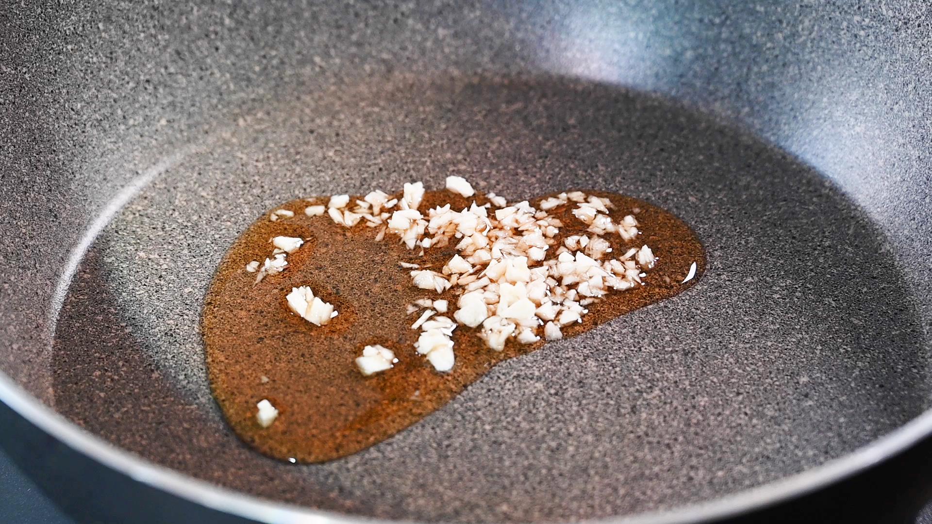 フライパンにニンニクのみじん切りとゴマ油を入れて、弱火にかけます。