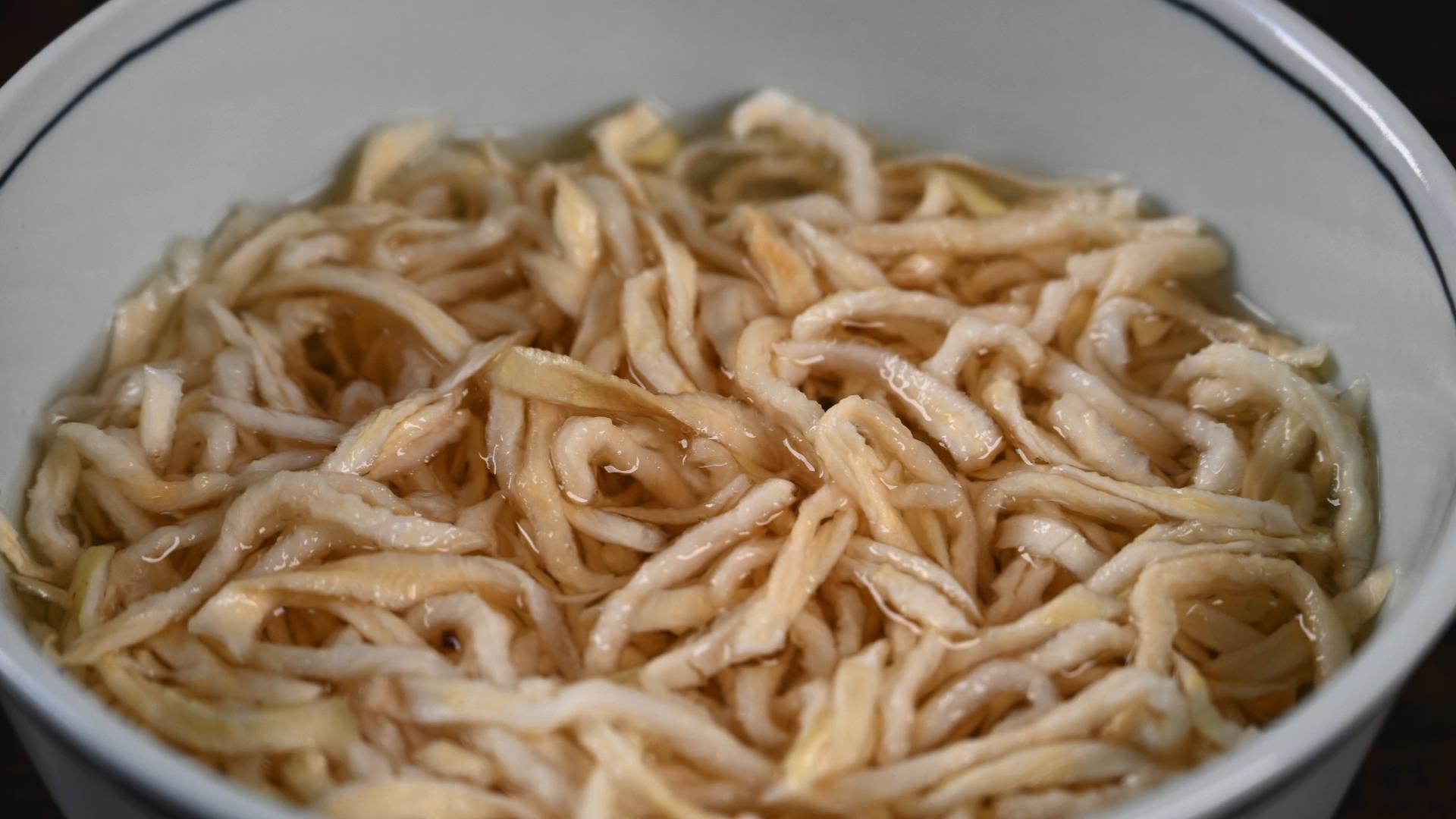 切り干し大根は水洗いしたあと、15分くらい水に浸してもどします。