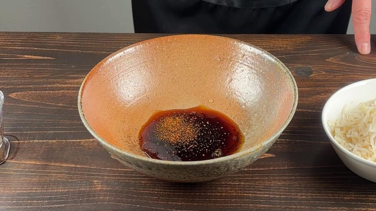 ボウルに煮切ったみりんと醤油、酢、七味または一味唐辛子を入れます。
