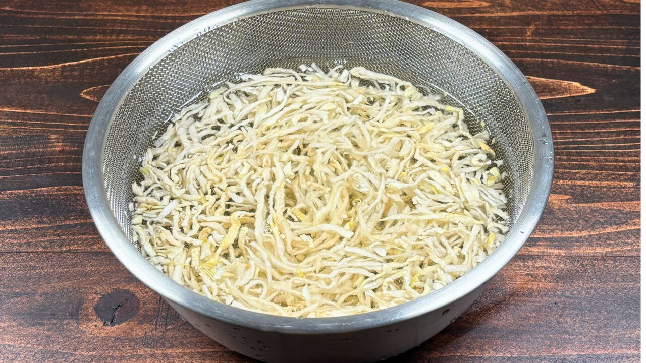 切り干し大根は水で洗ったあと、20分くらい水にひたして戻します。