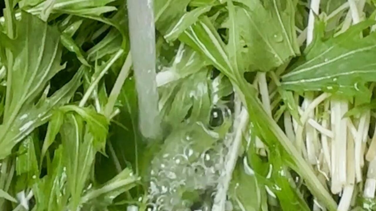 水菜を洗い、ザルにあげて良く水を切ります。