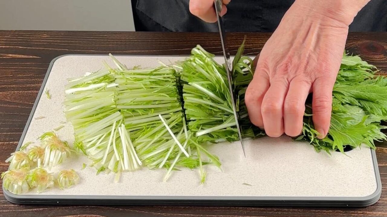 水菜は根元を切り落として5㎝位に切ります。