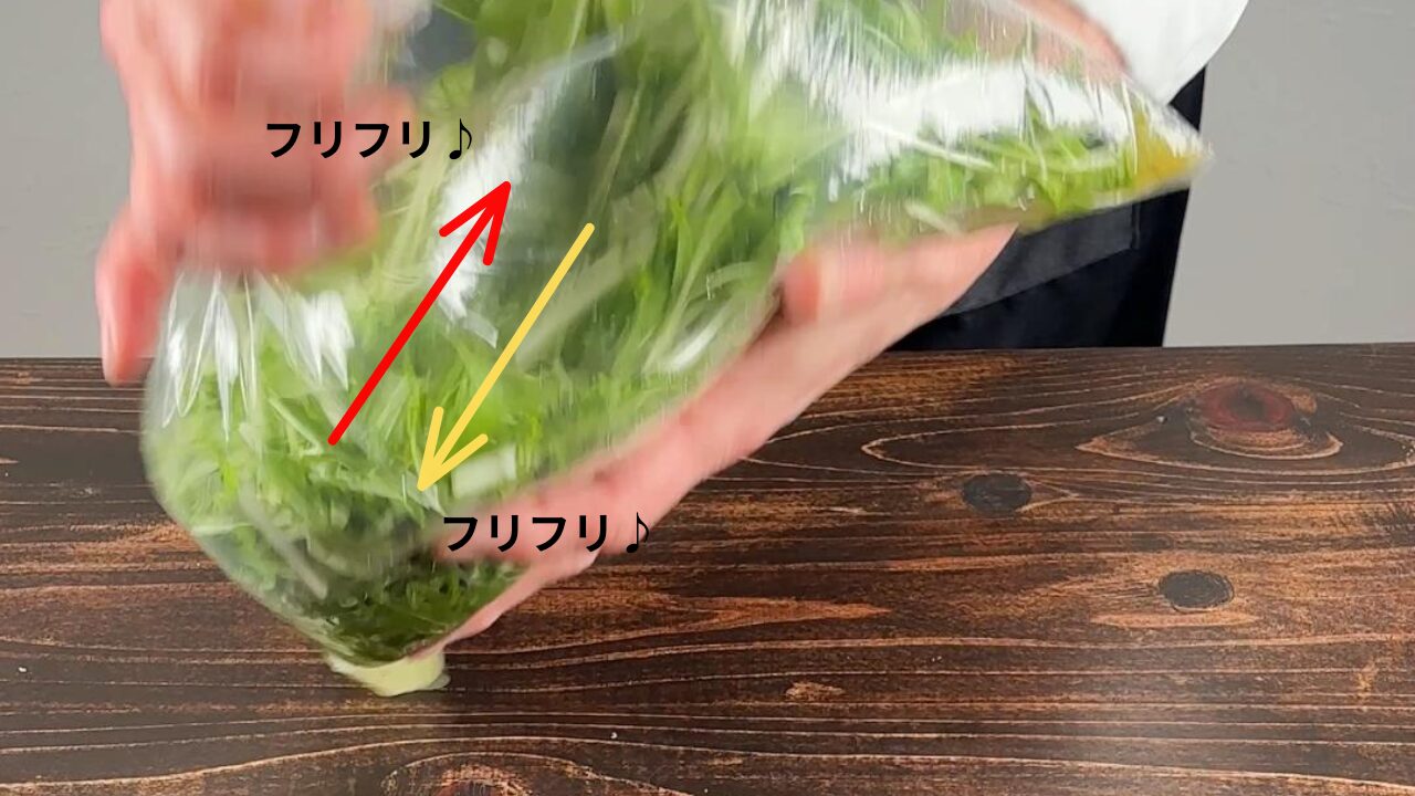 水菜も入れて振り混ぜます。