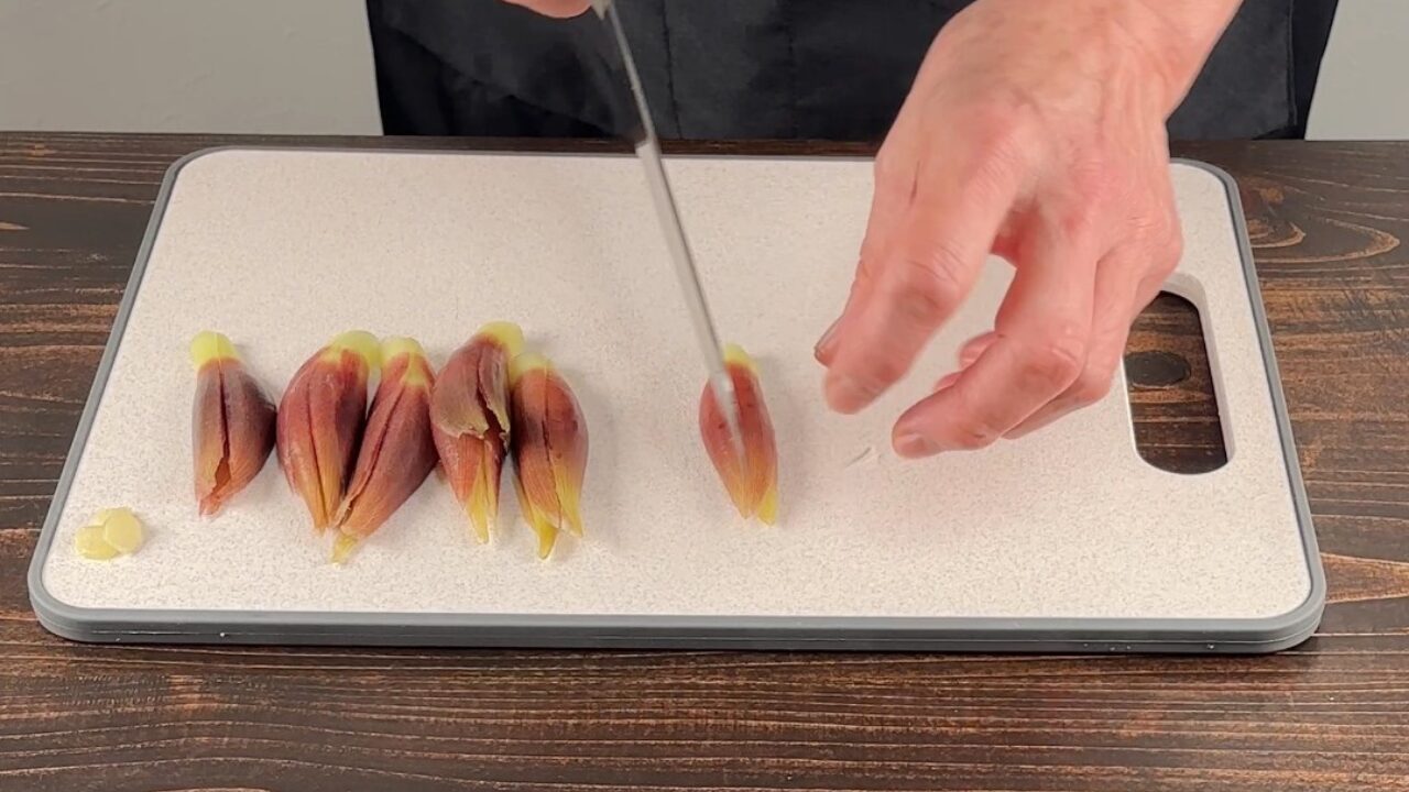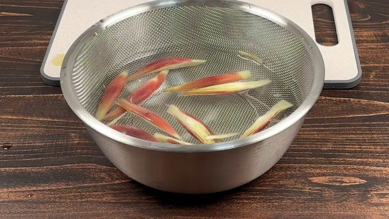 ミョウガは根元の乾燥した所を少し切り落とし、縦4つに切ります。