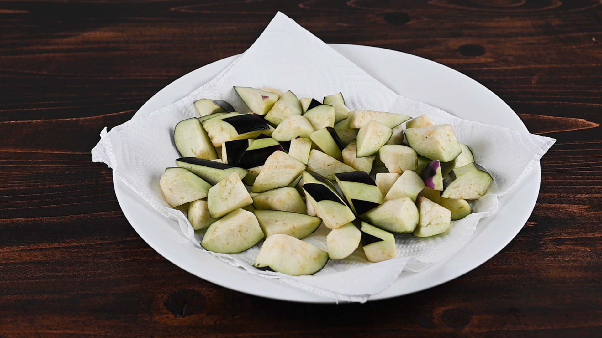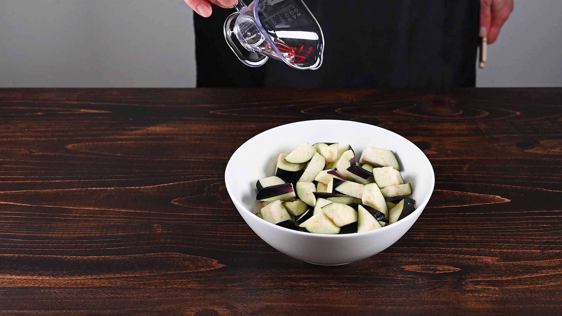 ナスをボウルに入れ、小さじ1杯のサラダ油をまぶします。