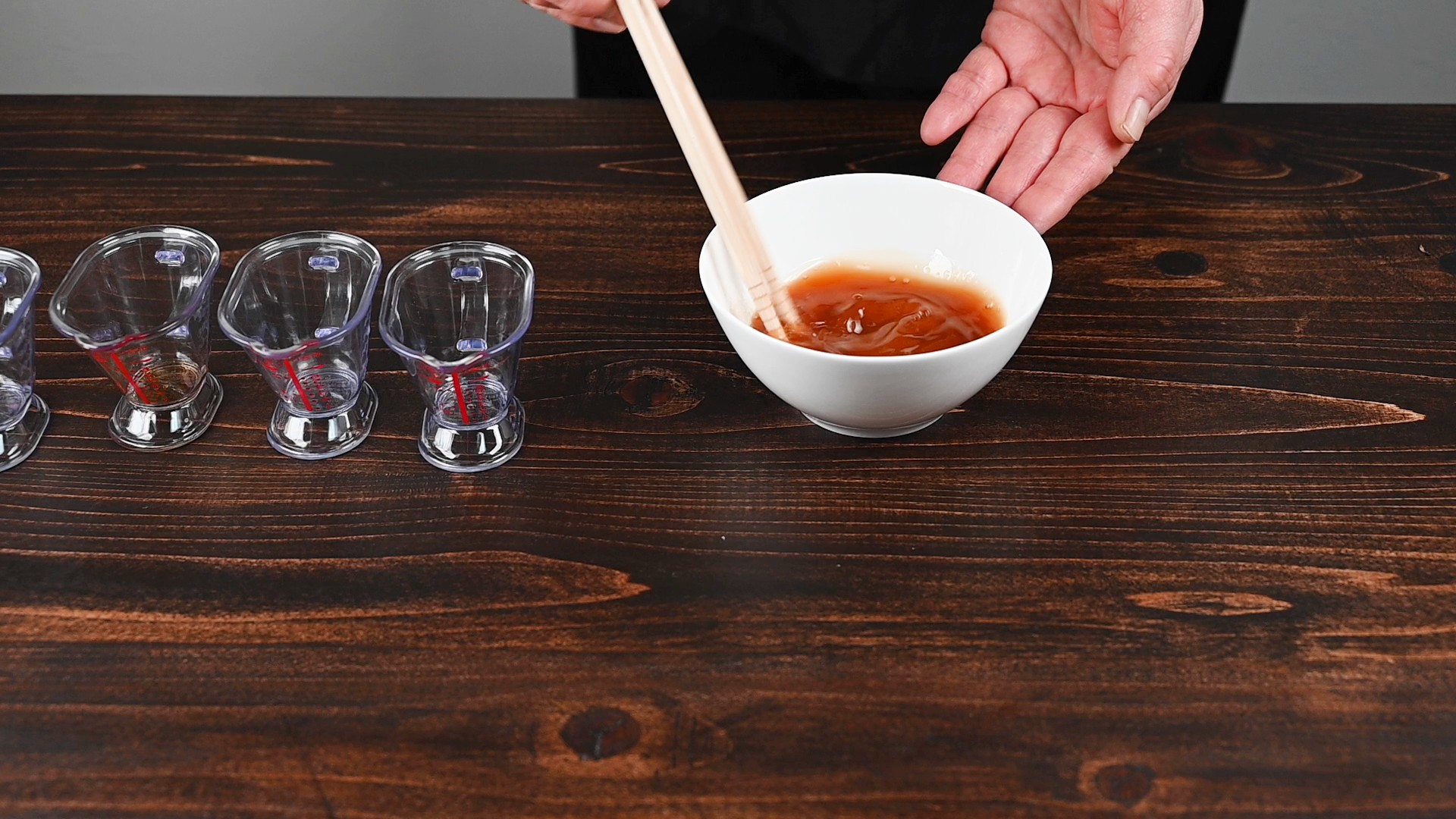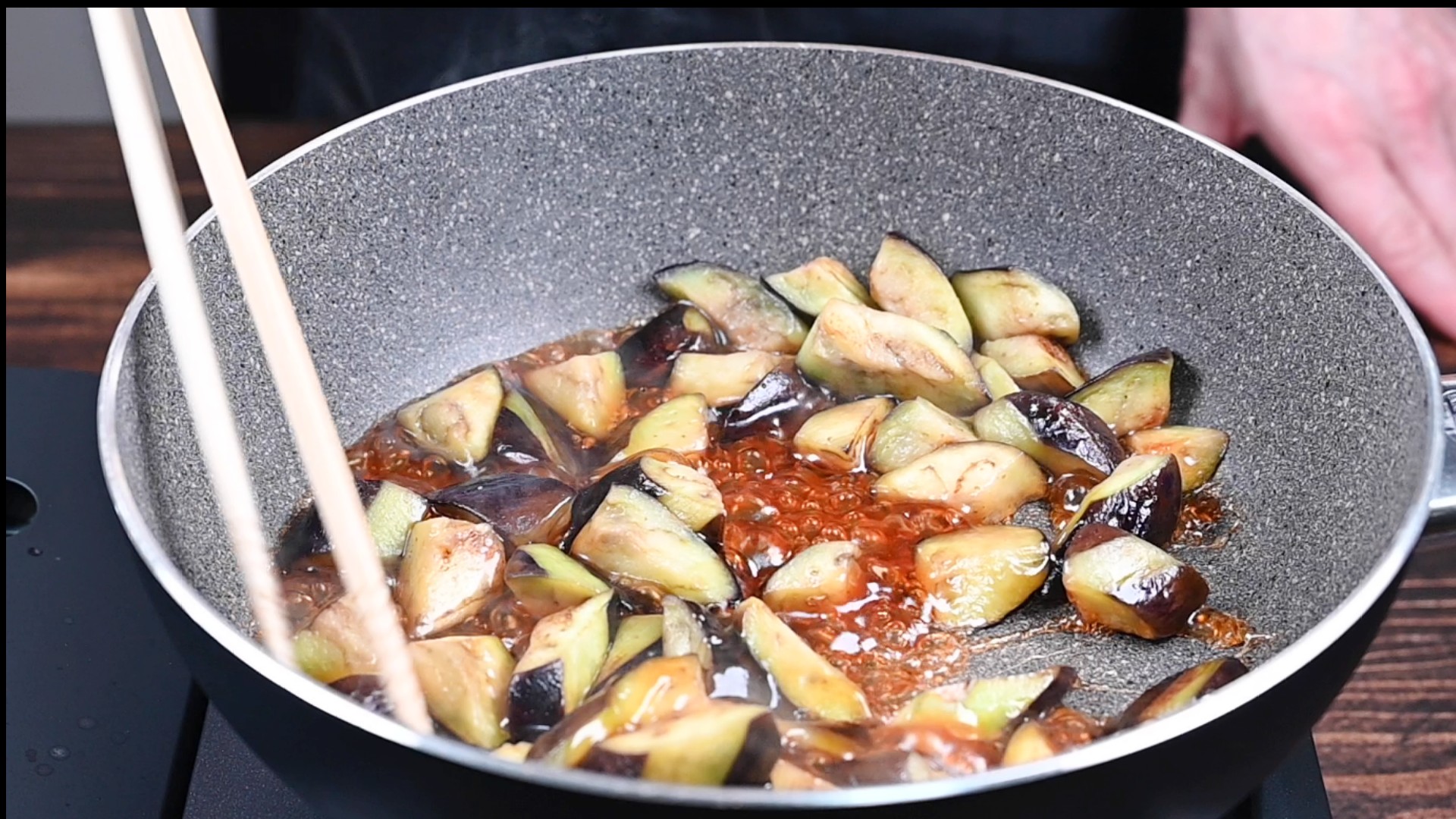 ナスに火が通ったらいったん火を止め、混ぜ合わせておいた調味料を入れ、弱火でからめます。