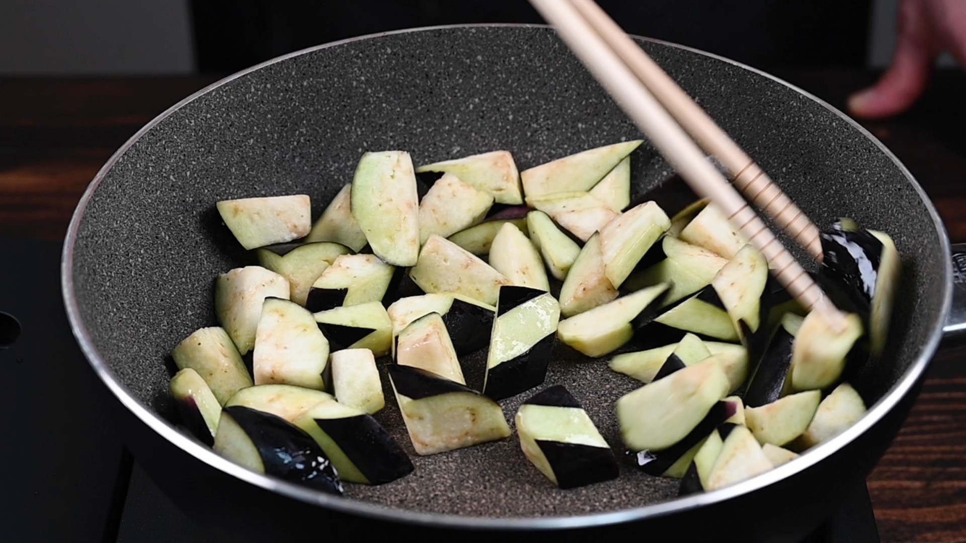 ナスに油をまぶして5分位たったら、フライパンにサラダ油(小さじ1)をひき、やや弱めの中火でナスを炒めます。