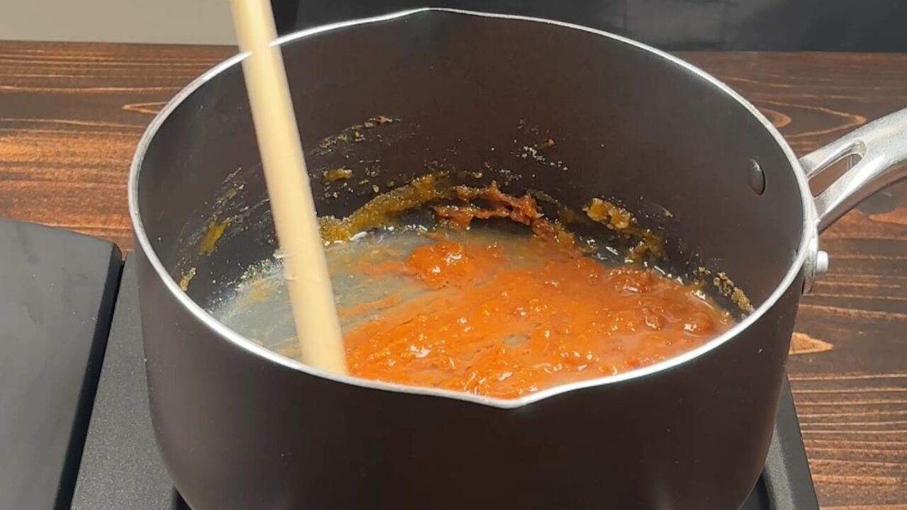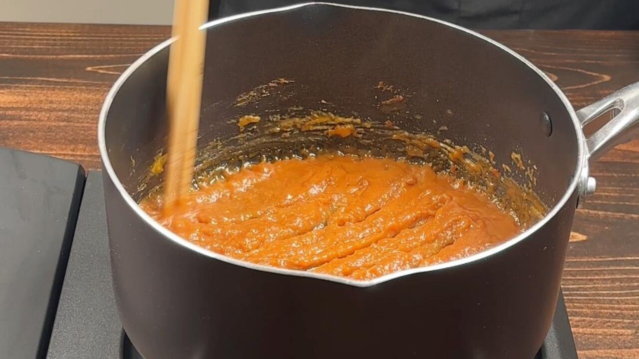 鍋を弱火にかけ、こがさないよう、ぽってりとつやが出るまで練り、山椒を振ります。