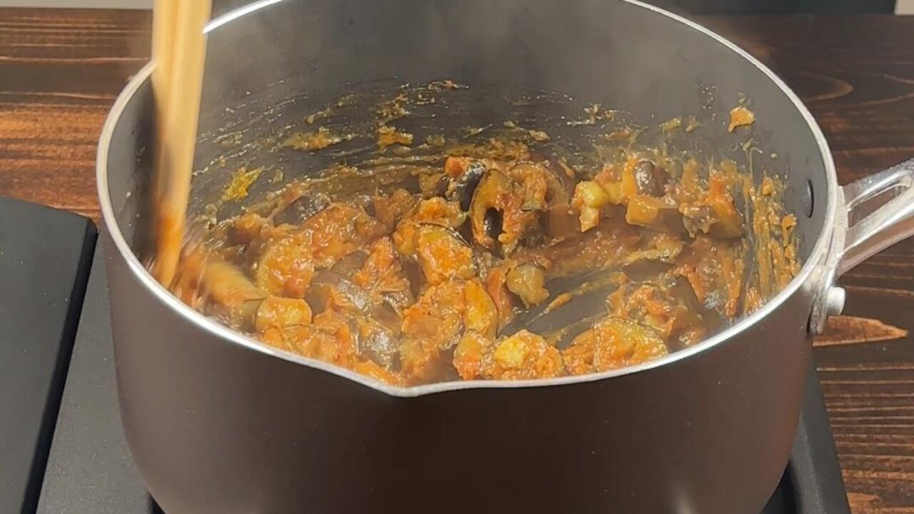 ナスがしんなりして、おいしそうな焼き色がついたら味噌の鍋に入れて和えます。