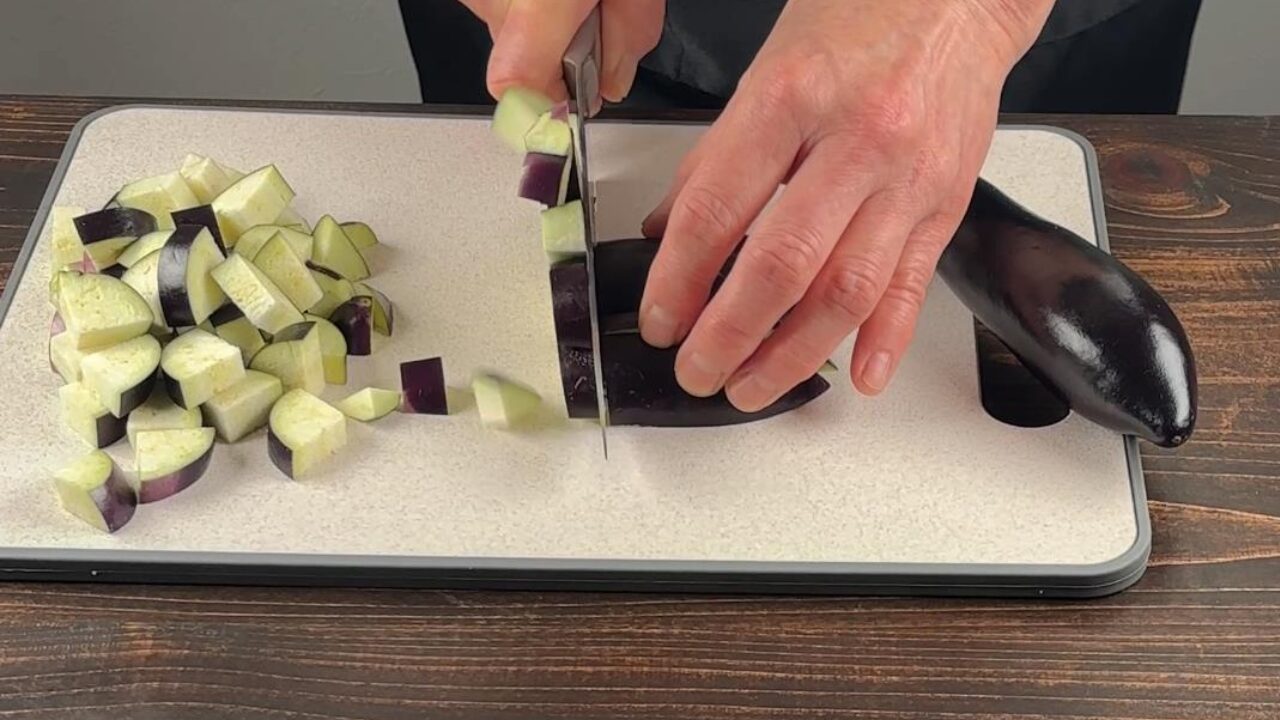 ナスは洗ってヘタを落とし、イチョウ切りにします。