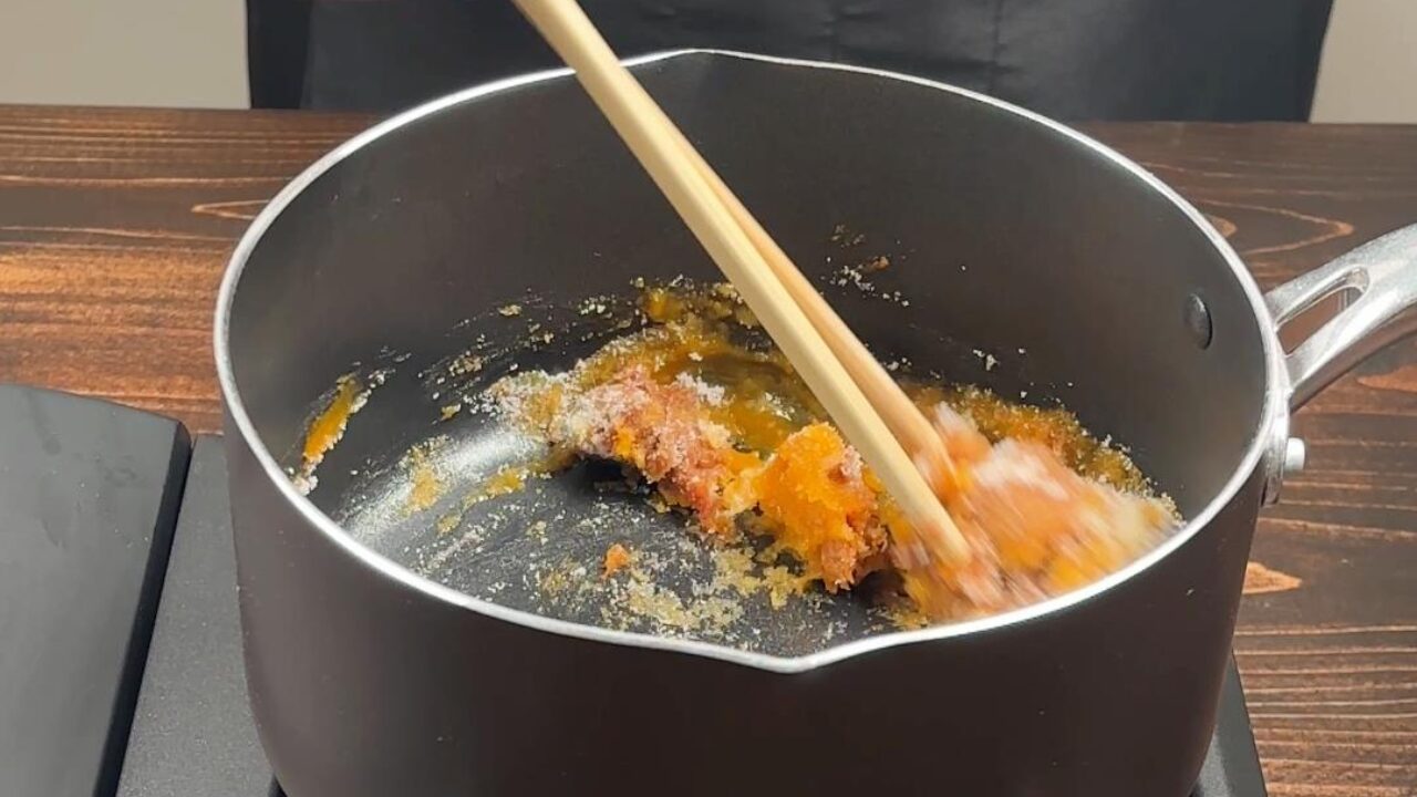 鍋に味噌と卵黄、砂糖、おろしショウガを入れて混ぜます。