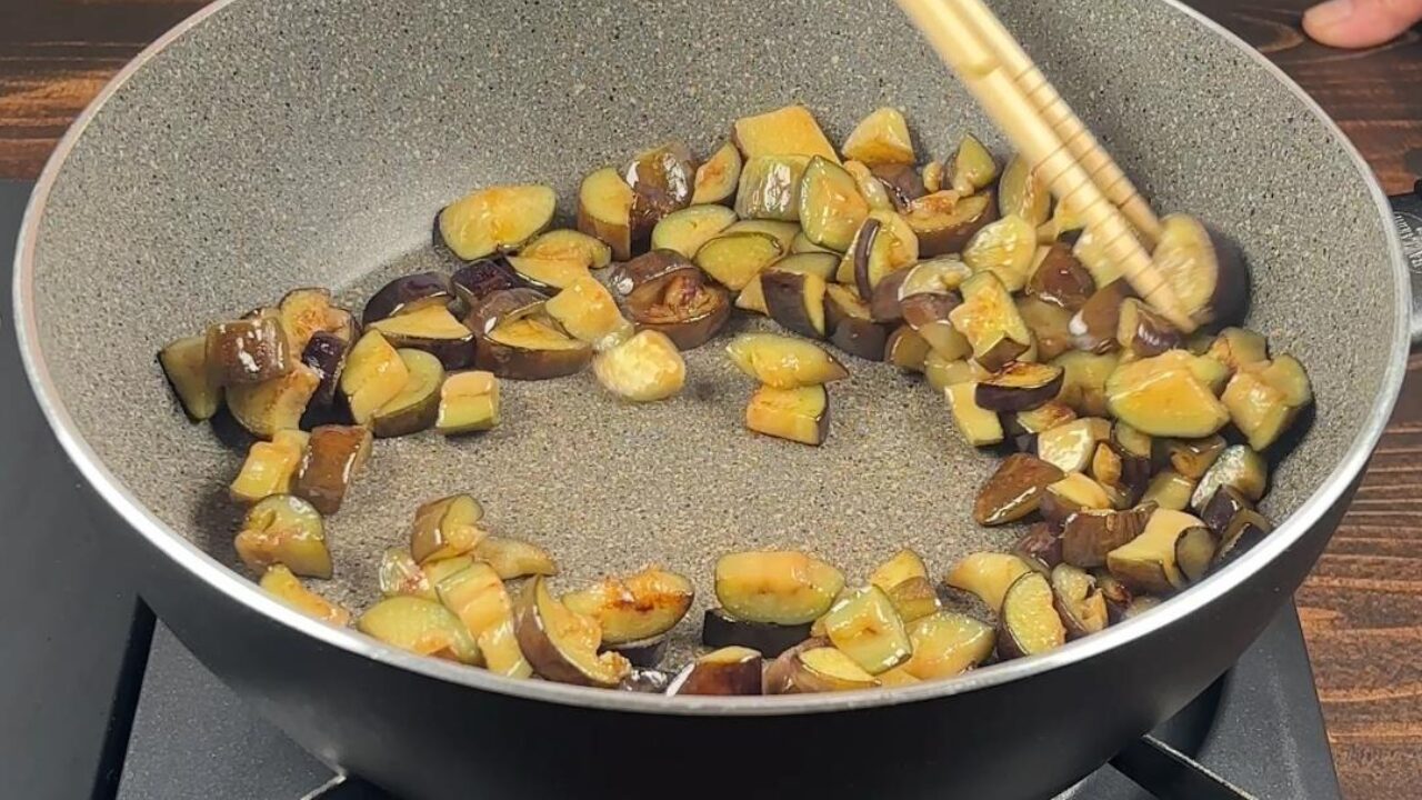 フライパンにゴマ油を強めの中火で熱し、ナスを炒めます。