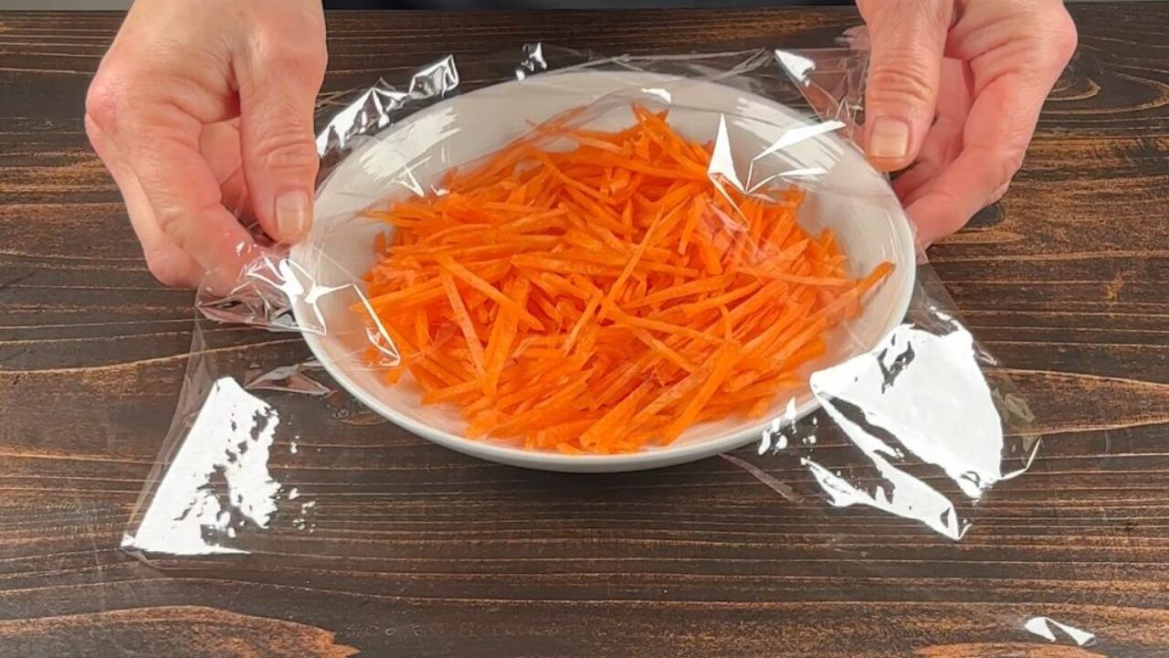 加熱後、にんじんから水が出ていたら、キッチンタオルで吸い取ります。