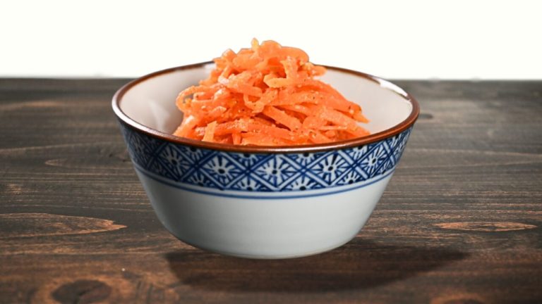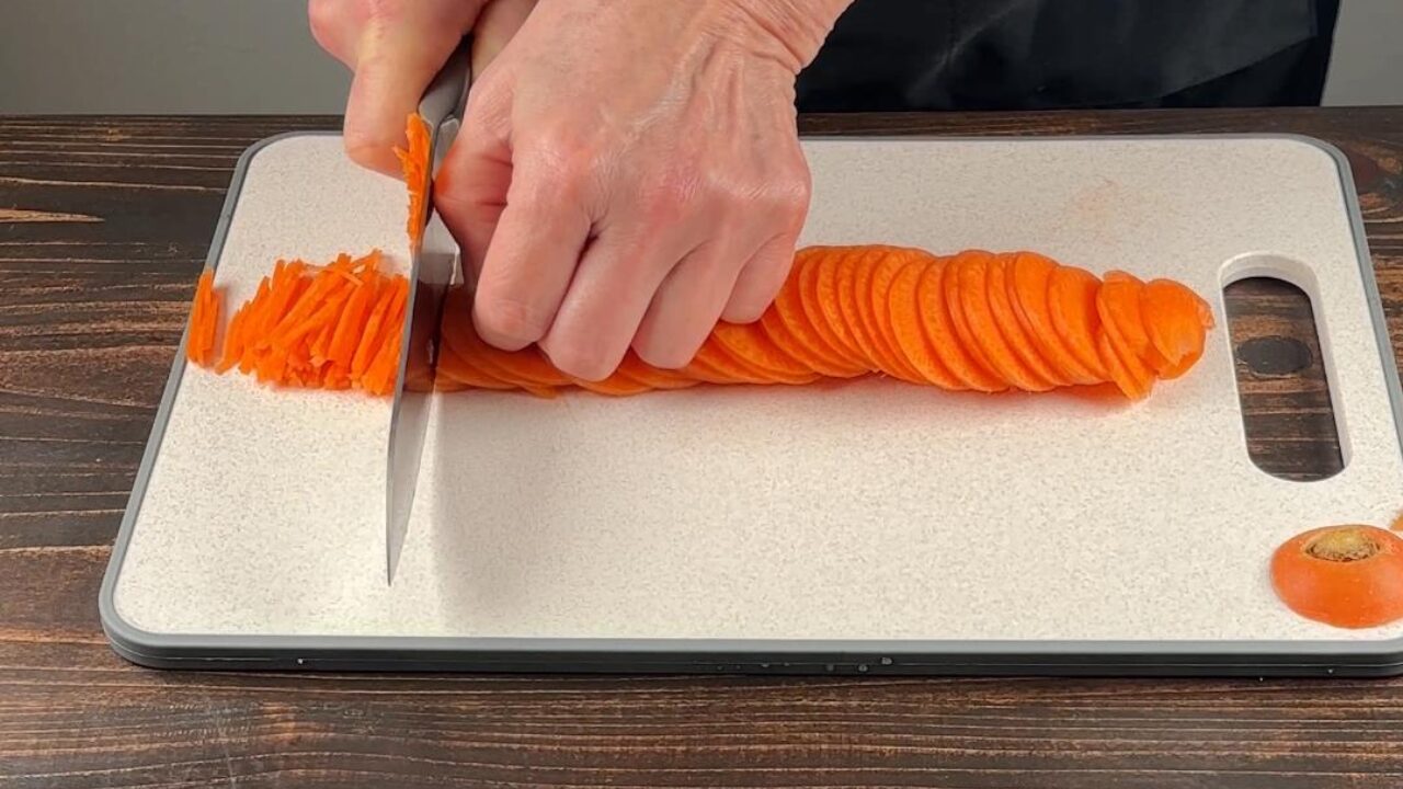 にんじんは斜め薄切りにして千切りにします。