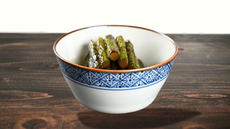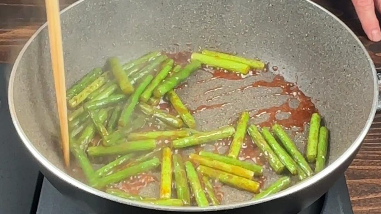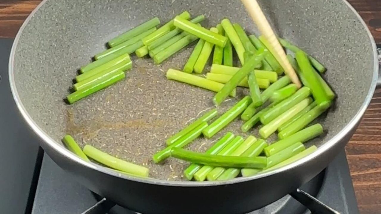 ニンニクの芽がしんなりしたら火を止め、混ぜ合わせた調味料を入れて余熱でからめます。